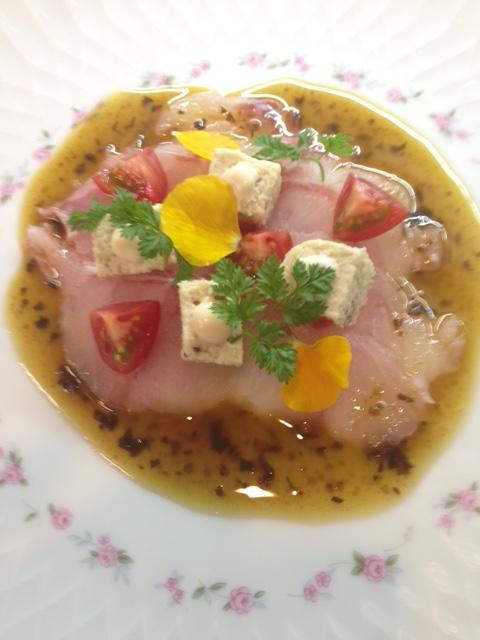 青ハタのカルパッチョです。帆立貝のテリーヌとプチトマトを添えて!今日は暖かい〜なんとなく春爛漫です。m(__)m