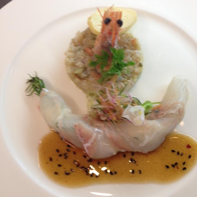 青森県産 天然鮃のカルパッチョとシオデの取り合わせです。 カルパッチョを曲げてみたら、写真で見ると…ん〜?