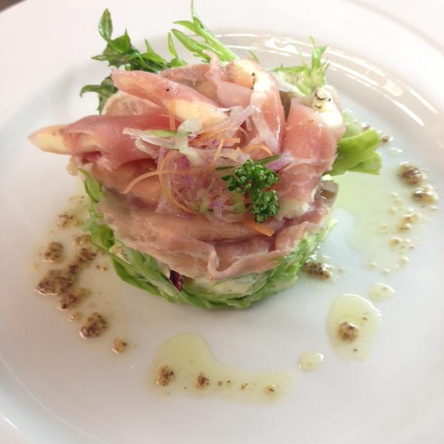 生ハム、モッツァレラ、水菜、グリーンリーフ、タルタルソース、トマトのコンフィなどで作りましたが、なんか違うな〜 (>_<) 普通 (笑)
