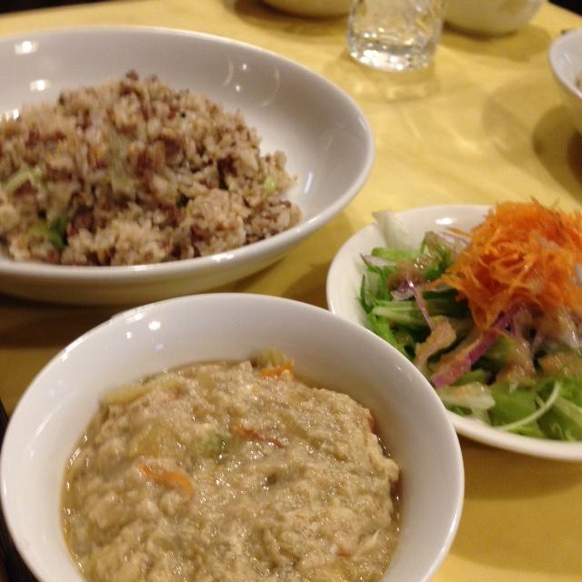 牛肉とレタスの焼き飯、サラダ、片栗粉で繋ぎすぎた玉子スープでした。 m(__)m