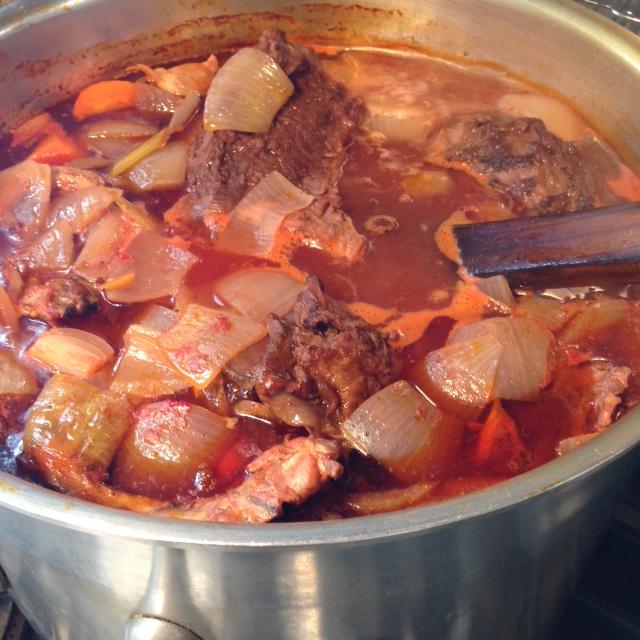 デミグラスソースの第1歩の仕込みです。ついでにシチュー用の肉も煮ちゃいます。