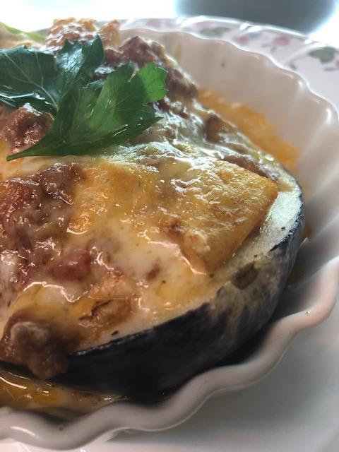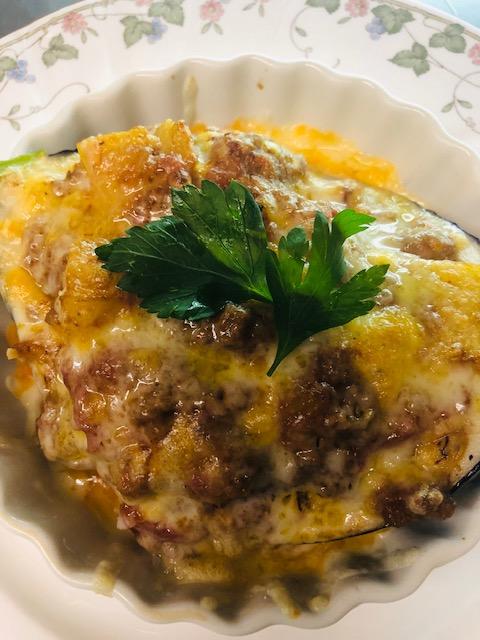 ゼブラ茄子と挽肉のトマトグラタン仕立てです。綺麗な縞模様の大きな茄子です。m(_ _)m